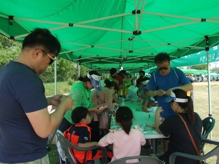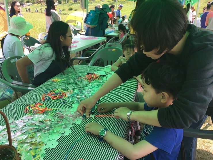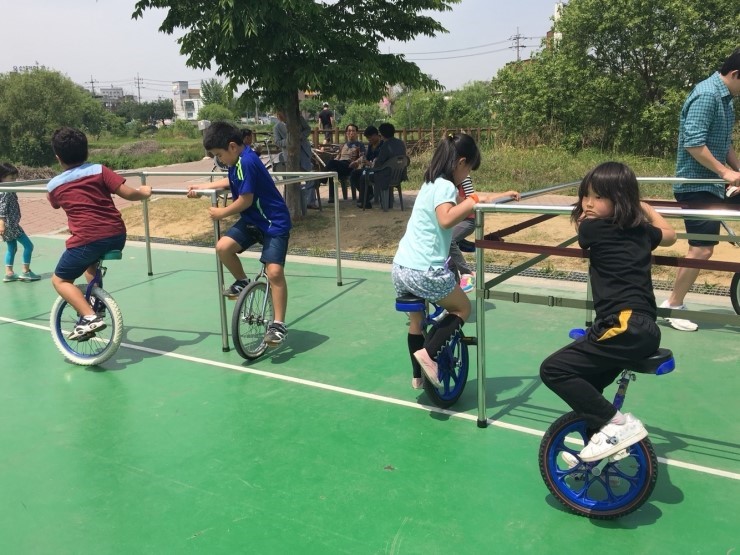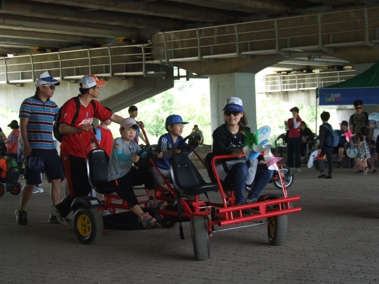 ▲ 외발자전거 연습 중인 어린이들과 이색자전거 체험을 하고 있는 가족들 반쪽이라는 별칭의 리사이클 전문 최정현 작가의 지도하에 철사를 이용해 아빠와 자전거 공작도 해보고, SBS ‘순간포착 세상에 이런일이’에 출연한 문태규씨의 'PP끈을 활용한 오산천 생태 곤충 만들기 체험'은 어린이들 눈에 신기하게 다가왔죠. 두 개의 줄을 서로 반대쪽으로 돌리는 줄넘기 놀이인 'Double-Touch 줄넘기 체험' 등 엄마, 아빠와 함께 하는 미술&공예 등 각종 체험으로 흥미와 재미가 넘치는 소중한 하루를 만들 수 있었습니다.