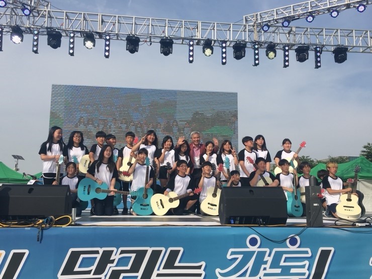 ▲ 1인1악기 기타연주를 한 필봉초등학교 6학년 3반 학생들이 오산시장과 기념촬영을 하고 있다. 마지막 인기가수들이 총출동한 축하공연을 보며 즐기는 시민들의 표정은 편안해 보였고 행복한 모습들 속에서 하루를 보내고 있었습니다.