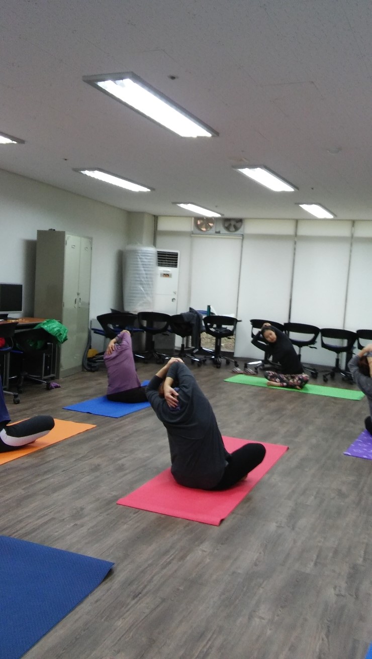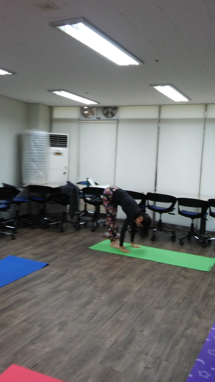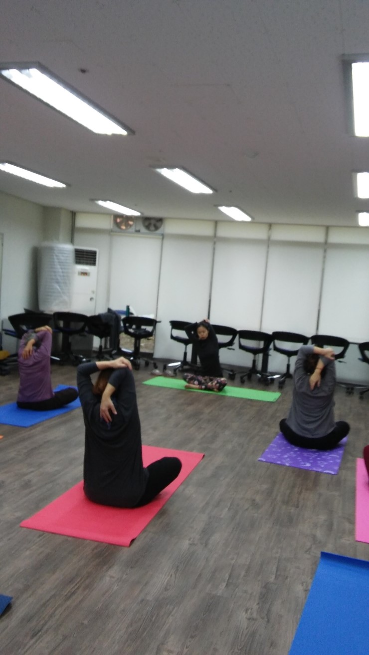 단전에 힘을 주고 마음을 정화시킨다. 그리고 스트레칭, 그 다음으로 호흡을 중요시하는 요가의 특성으로 강사님의 구령에 맞춰 하나 - 후우, 둘 -후우, 셋 - 후우로 모두 함께 호흡을 맞추고, 조금 힘이들지만 많이 좋아졌다는 강사님 창찬에 모두 힘을낸다.