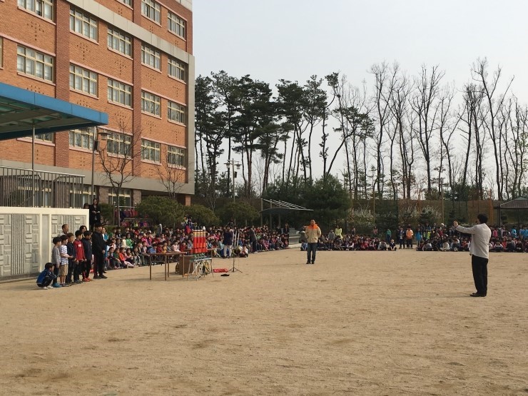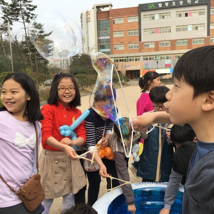 페이퍼 글라이더를 함께 날리며 반전체가 하나가 되어 보는 시간도 가져보고, 풍선헬기를 날려 보고 싶어서 풍선을 불고 있는 1학년 학생들의 볼이 발갛게 부풀어 귀엽기만 합니다. 필봉 어린이들의 과학적 탐구력과 창의력을 신장을 위한 기초 과학 교육의 일환으로 준비된 이 날 행사에서, 모든 어린이들은 과학 탐구 대회 활동으로 과학미술, 기계공학, 과학탐구토론, 항공우주의 4개 분야 중 하나를 선택하여 각자 기량을 뽐내기도 했습니다. 교장선생님의 풍선헬기와 페이퍼 글라이더 시범을 보고 환호성을 지르며 즐거워하는 순간또한 깊이 기억될 것입니다. “다음에도 과학체험 또 했으면 좋겠어요”, “생물 예를 들어 파리지옥 같은 식충식물을 관찰하거나 장수풍뎅이와 사슴벌레 배틀 같은 프로그램도 있었으면 좋겠어요”라고 의견을 내세우기도 한 만큼 즐기면서 배우는 과학체험의 인기를 실감할 수 있었던 날이었습니다. 오늘 보았던 비눗방울 중 가장 멀리 높이 나는 것은 필봉초등학교 어린이들의 꿈과 희망이었습니다.