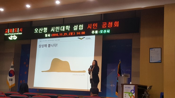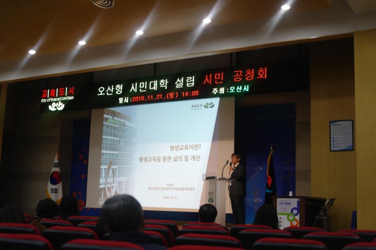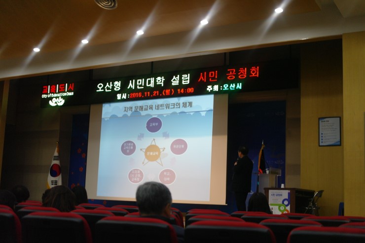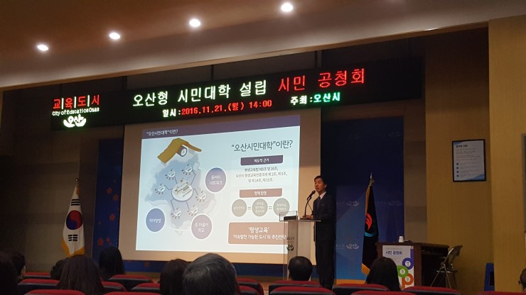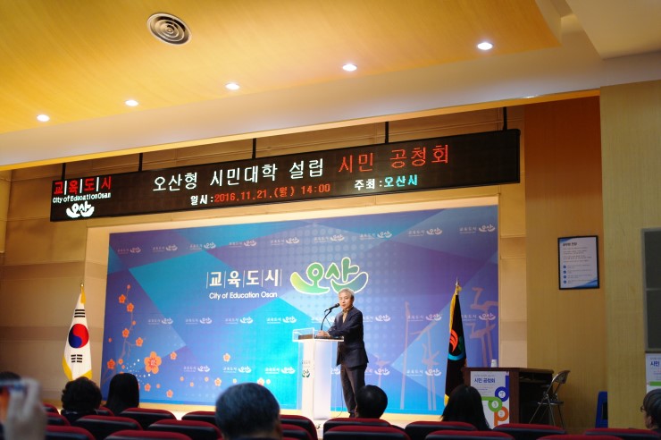 '오산형 시민대학 설립' 시민 공청회가 2016년 11월 21일 오후 2시부터 오산시청 대회의실에서 있었다. 이날의 공청회는 오산형 시민대학 설립 추진 계획을 설명하고 시민, 전문가, 관계 실무자 등 다양한 의견 청취를 통해 시민대학 설립 질의· 응답 및 청취를 하는 시간이었다.