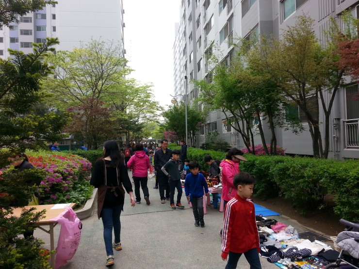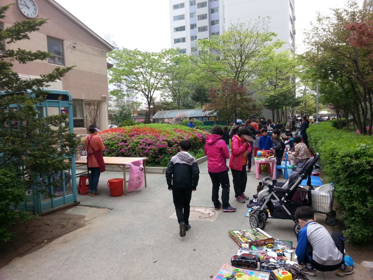 골목에서 서로 얼굴을 마주하고 살던 시대는 우리의 기억 속에 따스하게 남아있지요? 하지만 우리의 현실은 골목과는 사뭇 다릅니다. 오산의 22만 시민 중 대부분이 아파트에 거주하고 있다는데요. 이미 아파트가 20세기에서 21세기에까지 이어지는 대한민국의 주거형태가 되었으니, 우리시대의 아날로그적 감성과 이웃과의 정을 나누는 것을 가르치고자 2016년 4월 23일 토요일 운암1단지에서 열린 아이들의 아나바다 장터입니다.