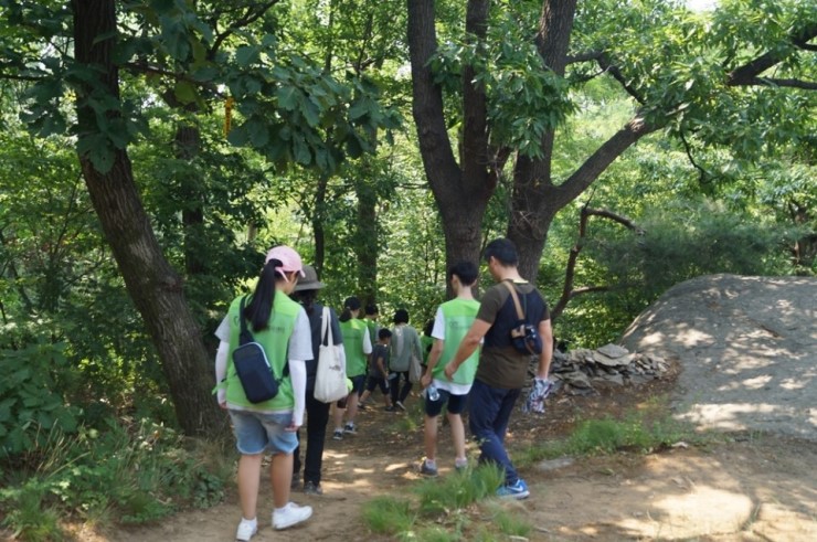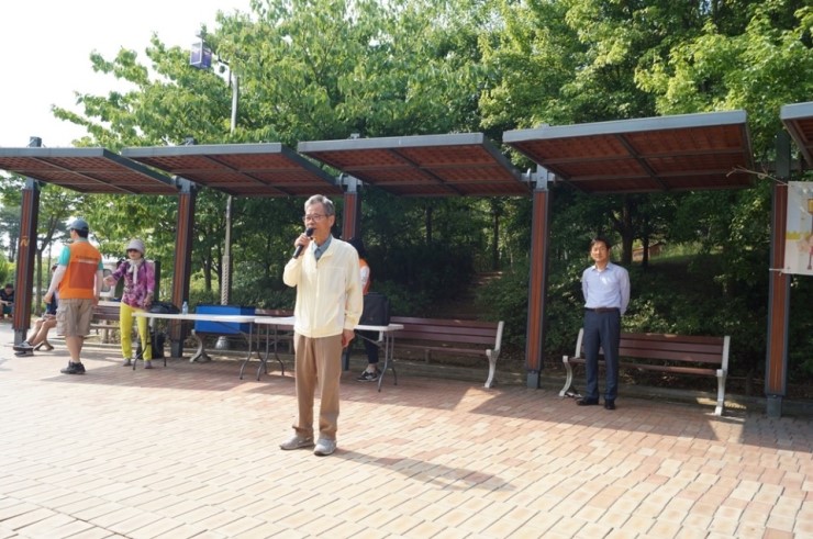 ▲ 봉사자들이 류 이사장의 인사말을 듣고 있다. 이날 환경정화 활동은 고인돌공원을 출발하여 여계산[如鷄山] 등산로를 따라 정상까지 등산 겸 등산로 쓰레기를 수거하고 여계산 남부로 하산하여 세교 6단지 인근 도로를 경유, 세교 7단지, 4, 5단지 주변 도로의 쓰레기를 수거하면서 세교 중심상가에 도착하여 오전 정화 활동을 마무리하고 약 1톤의 쓰레기를 수거했다.