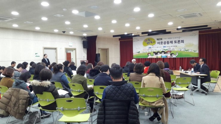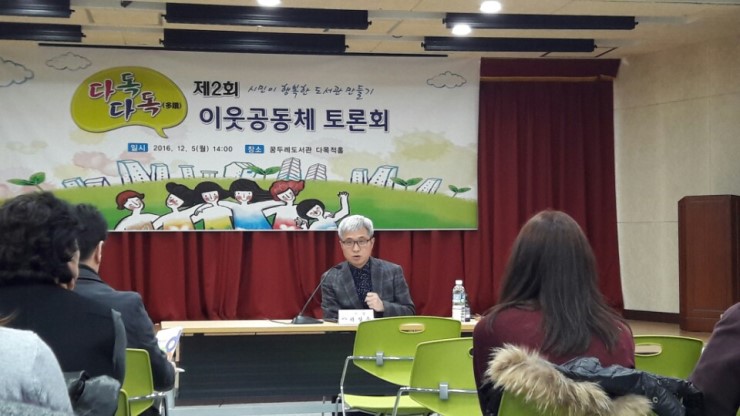 지난 12월 5일 꿈두레도서관 다목적홀(지하1층)에서 열렸던 “다독다독 이웃공동체 토론회” 모습이다. 오산시에 소재한 도서관들은 그동안 『시민중심 봉사자 운영 도서관』사업(햇살마루와 양산도서관을 중심으로)을 통해서 효율적으로 도서관을 운영하고 시민들의 재능기부를 통해 시민들의 도서관에 대한 관심과 참여를 높이는 두 마리 토끼를 잡아왔다.