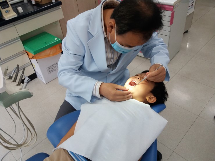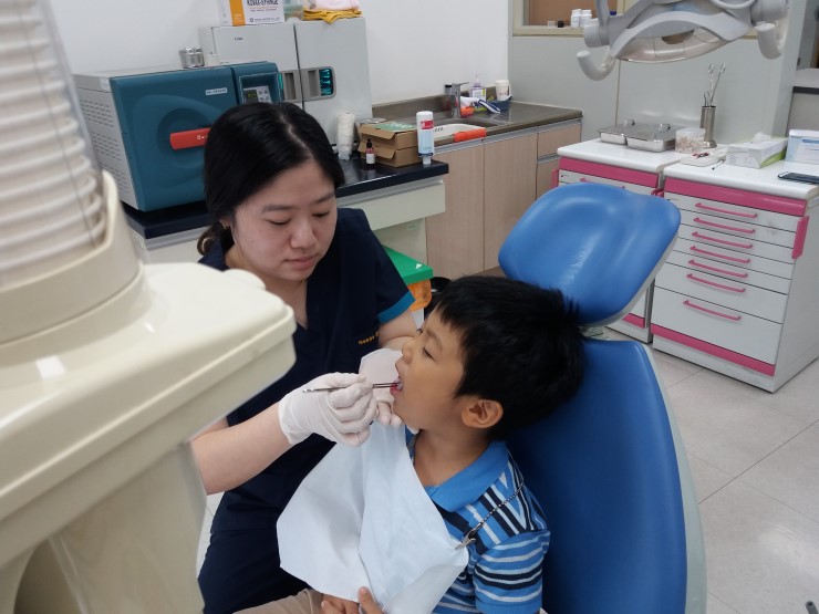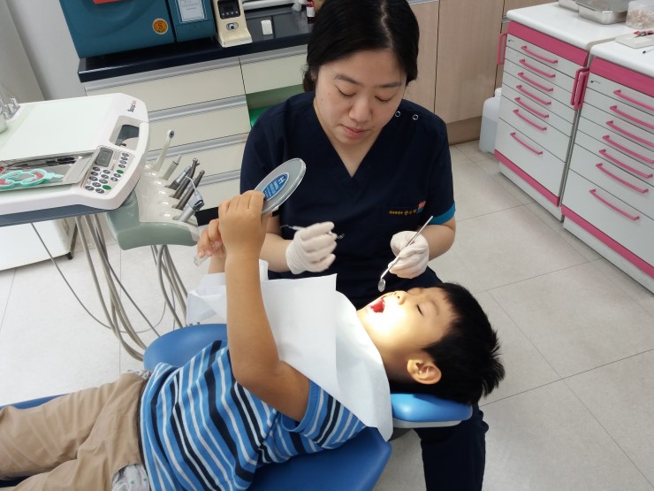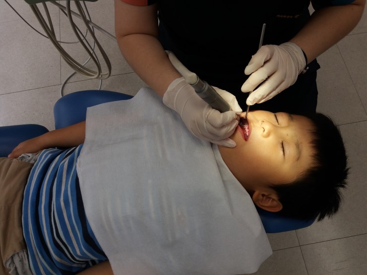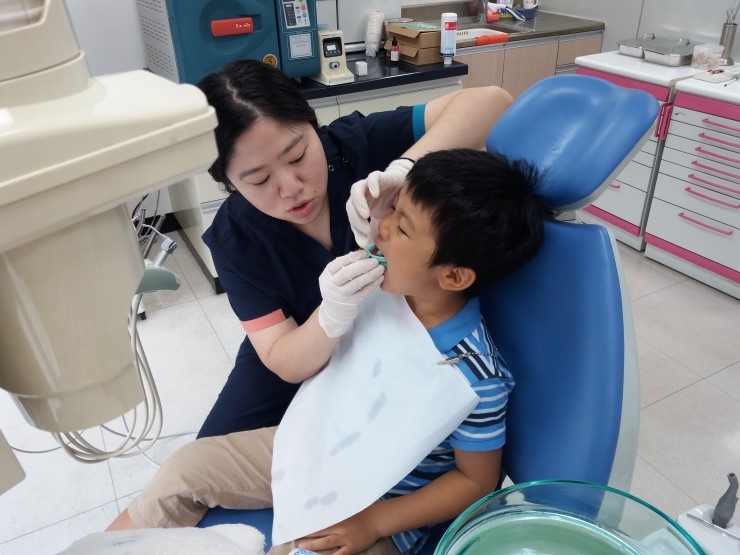 불소 도포 직전 치과위생사 선생님께서 치아를 꼼꼼하게 닦아 주고 계십니다.