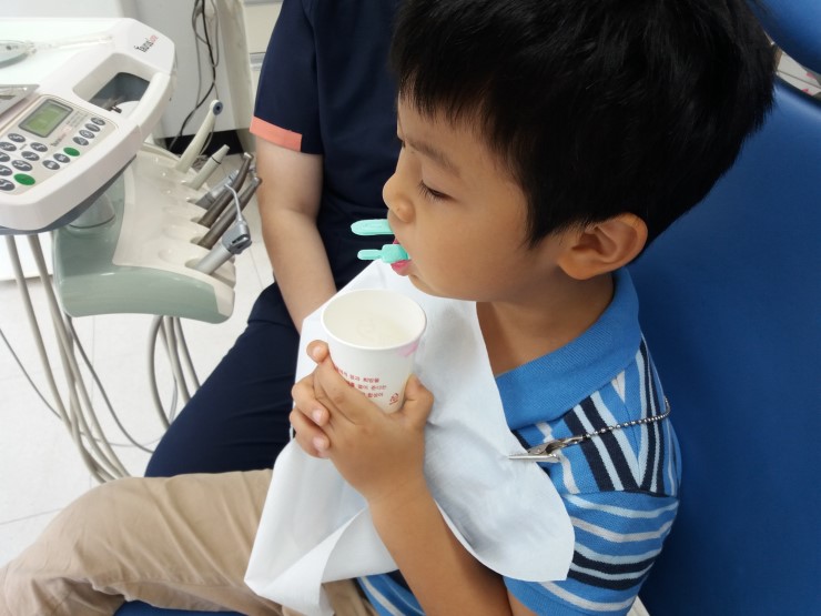 불소 도포가 끝난 후 입안에 남아 있는 불소겔을 깨끗하게 닦아주셨습니다.