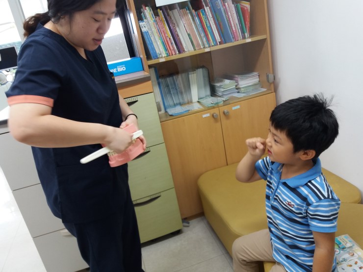 올바른 양치질 방법을 배우는 중입니다. 역시 엄마의 잔소리보다 치과위생사 선생님의 설명이 더 효과적이네요.
