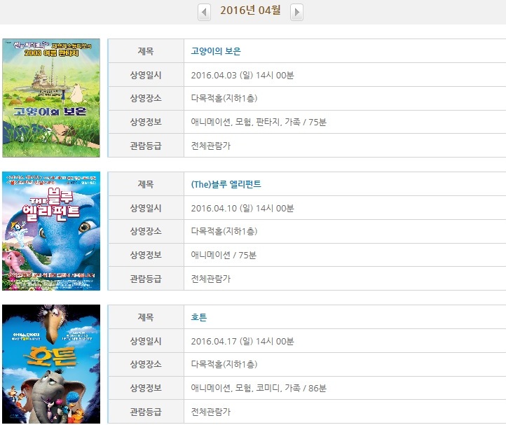 오늘은 이곳에서 [도라에몽 : 진구의 마계대모험] 영화를 상영하는 날이었죠. 엄마와 아빠 손, 할머니 손을 잡고 다목적홀(지하1층)으로 들어오는 모습은 참으로 보기 좋았습니다. 아이들은 익숙 한 듯 알아서 한 자리씩 차지하며 앉고, 부모들은 뒤쪽에 앉아서 만화영화를 함께 지켜보았습니다.