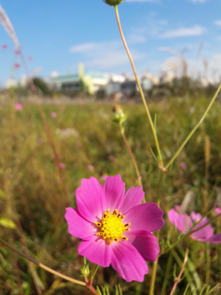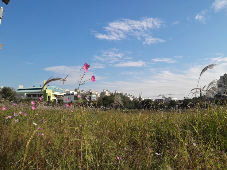 가을의 전령사 코스모스 너머에는 오산문화원과 오산시민회관이 보입니다.