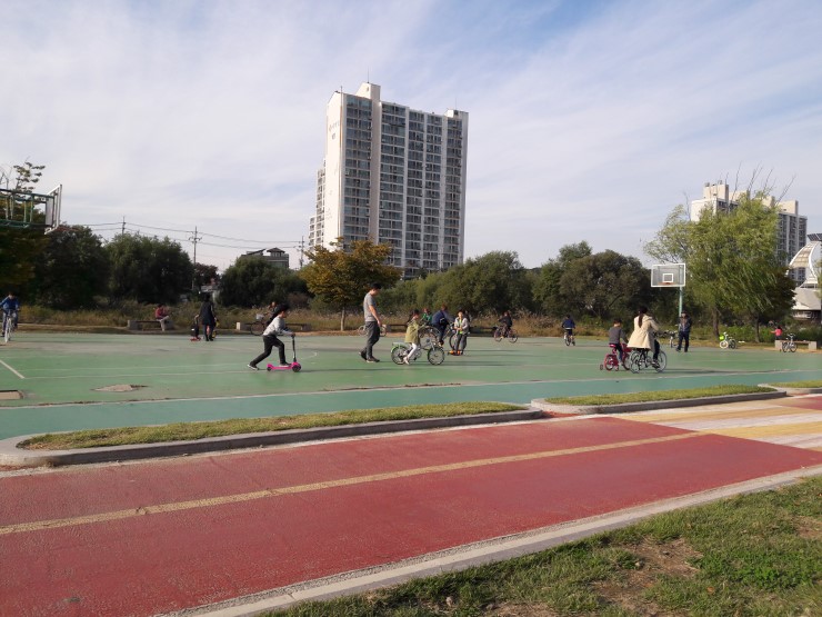 농구장에는 주말에 나들이를 나온 가족들이 많았어요.