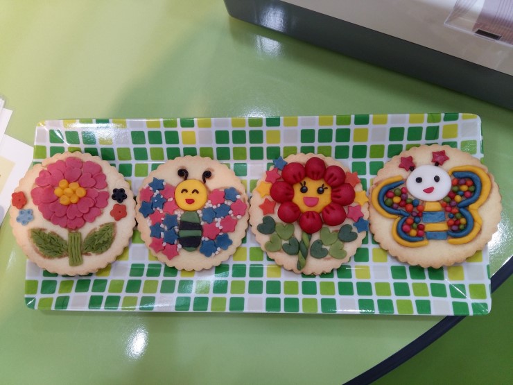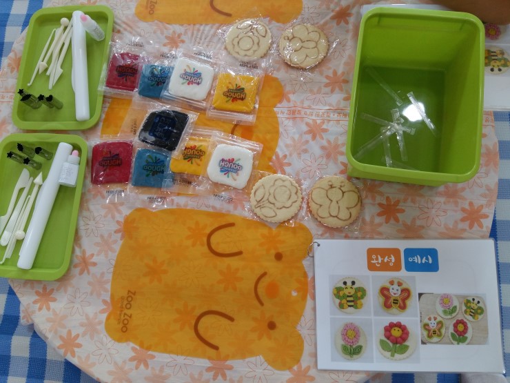 여러가지 색깔의 떡을 가지고 다양한 도구를 활용해 쿠키 위에 그려진 나비와 꽃을 채우는 활동이었습니다. 아이들은 서로 다른 색의 떡들을 합쳐 새로운 색의 떡을 만들고 모양 커터로 떡을 찍어내고 조각칼로 떡을 썰며 쉴 새 없이 1시간을 보냈습니다.