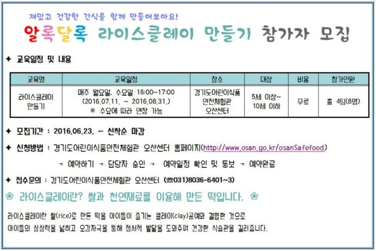 | 오산시 어린이식품안전체험관, 엄마와 함께 하는 라이스클레이만들기<시민기자 이한나>; | |||||||