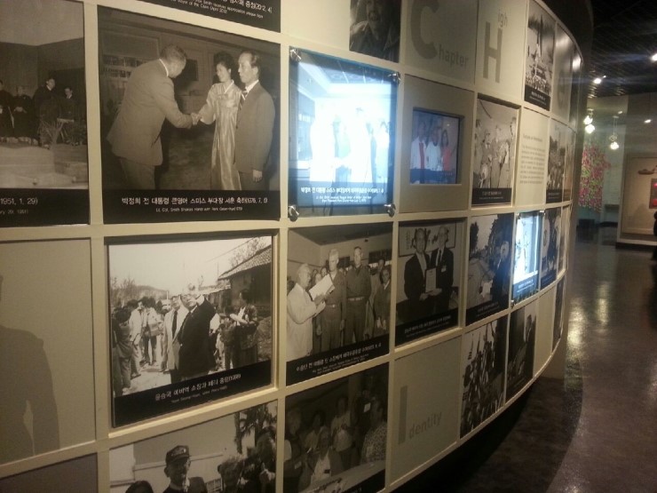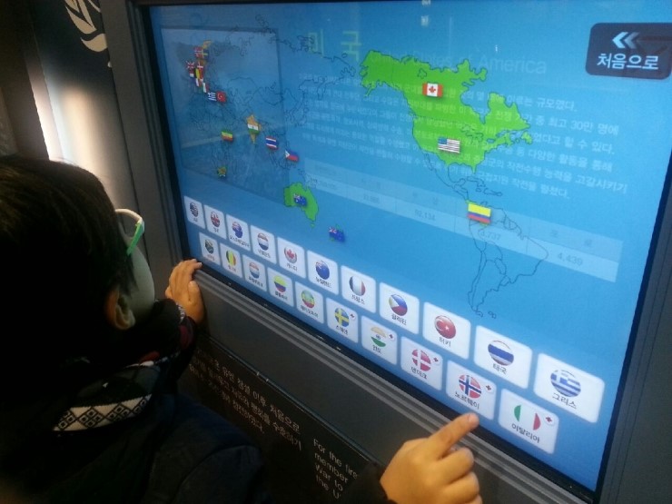 늦은 오후라 관람시간이 몇 분 남지 않아 아이들에게 주위사항을 설명한 후 바로 입장하였는데 아들의 시선을 자극하는 건 전쟁에서 어떤 나라가 우리를 도와주었는지 하나하나 버튼을 눌러보며 알아가는 것이네요.
