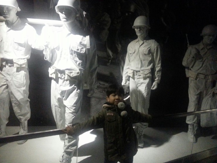 전시된 군인들의 모형 모습이 신기하기만 한가봅니다. 군인 아저씨와 같이 사진찍고 싶다며 스마일 하네요. 6.25전쟁이 왜 일어났는지에 대해 간단히 설명한 후 너희들도 우리가족의 평화를 위해 싸우면 안된다고 충고했습니다.