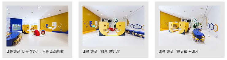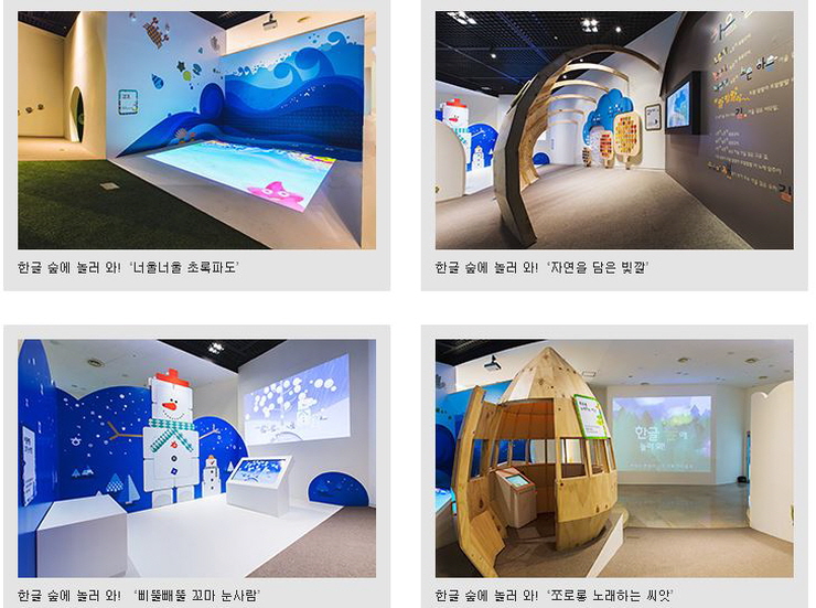 국립 한글 박물관 3층 한글 놀이터는 취학전 아동 6세부터 초등학교 2학년 학생들이 즐겁게 놀면서 한글이 가진 의미를 경험하는 체험 전시공간으로 마련되어 있습니다. '쉬운 한글, 예쁜 한글, 한글 문예동산'으로 구분하여 위에서 설명하였던 한글의 원리를 배우게 됩니다.