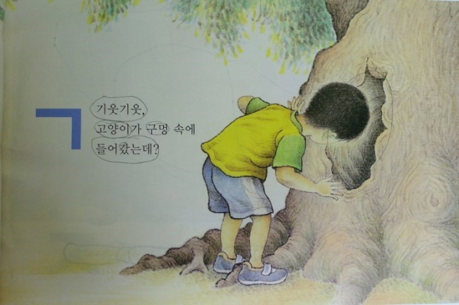국어활동 1-1 가권, 2단원 재미있는 낱자 단원에서는 글자에 대한 다양한 활동을 경험하게 하도록 하기 위해 『개구쟁이 ㄱ, ㄴ, ㄷ, 』(이억배 글.그림, 사계절) 이 수록이 되어 있습니다. 창작 그림 동화 『개구쟁이 ㄱ, ㄴ, ㄷ, 』는 구멍 속에 들어간 고양이를 찾는 아이가 도깨비와 동물을 만나게 되는데 여기에 한글 닿소리(자음)를 활용해 문장을 만들게 됩니다.