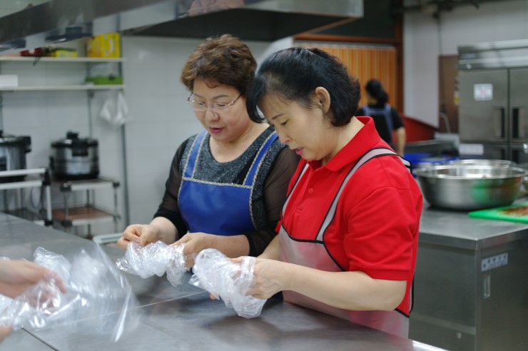 주말 이른 아침, 봉사자들이 모였다. 이들은 오산시 자원봉사 센터에 등록되어 있는 “사랑의 도시락” 봉사자들이다. 오늘 각 가정에 배달할 음식을 준비하는 손길이 분주하다.