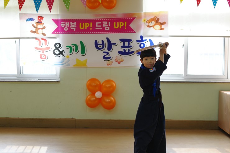 검도 시범을 보이는 '함승주' 학생이다. 교실 무대 위에서 나를 다시금 멋지게 표현했다. 늠름한 학생 발표를 보면서 엄마 미소가 절로 나왔다.