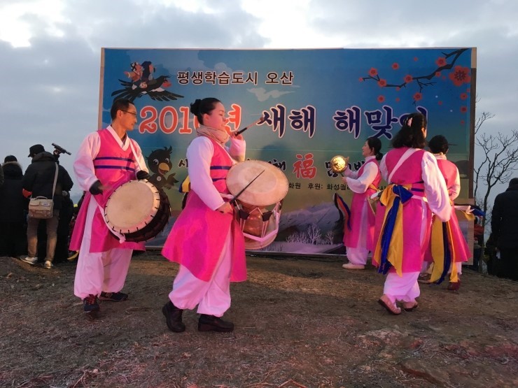 ▲오산문화원에서 주관한 사물놀이공연 해 뜰 시간이 되었지만 아니, 해는 떴지만 구름이 자꾸만 방해를 해서 기대했던 장엄한 일출 장면은 볼 수 없었다. 아침잠이 많은 내가 처음 큰 맘 먹고 해맞이 한다며 새벽부터 아이들을 깨워 서둘러 왔는데 구름이 얄밉기도 하고 섭섭하기도 했지만 소망을 담아 풍선 띄우며 해맑게 웃는 아이들의 미소를 보니 좀 전의 마음이 싹 사라졌다.