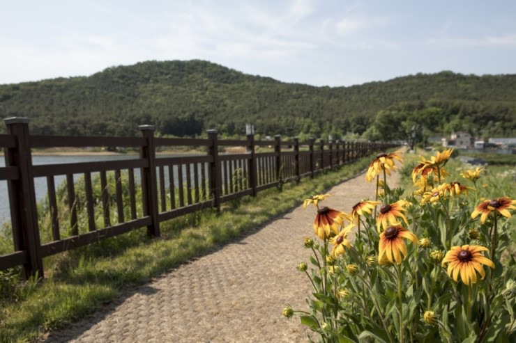 ▲ 푹신한 매트가 깔린 산책로를 걷다 보면 산들바람이 불어와 더위를 잊게 해 준다. 서랑저수지 일대를 둘러보려면 가마길을 건너 저수지 쪽으로 가면 된다. 제방 아래엔 오산시의 시조인 까산이가 날개를 활짝 펴고 탐방객을 맞이한다. 아치형 구조물인 서랑문, 운주문, 진남문 옆에 심어놓은 수세미와 조롱박이 자라서 구조물을 덮으면 시원한 그늘과 색다른 볼거리를 제공해 줄 것이다.
