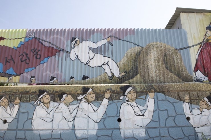 ▲ 서랑동 줄다리기 모습을 그려놓은 대형 벽화의 일부 산책로를 둘러본 후엔 서랑동의 골목길을 천천히 걸어보자. 골목 입구에는 서랑동 줄다리기 장면을 실감나게 그린 초대형 벽화가 눈길을 사로잡는다. 이밖에도 거북놀이 벽화와 오산의 옛 사진이 전시되어 있다. 급속한 도시화가 진행된 지금의 오산시가 아닌 작고 아담했던 오산의 옛 정취를 떠올리게 하는 귀중한 자료이다.