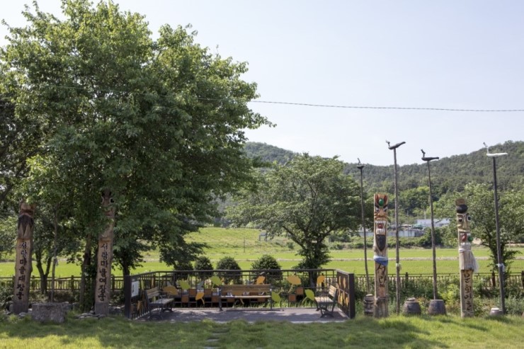 ▲ 은행쉼터의 장승과 솟대가 서랑문화마을 탐방객을 맞이하고 있다. 문화마을을 처음 방문한 사람은 은행쉼터에 마련된 종합안내도를 꼼꼼하게 살펴본 후 탐방 코스를 정하면 된다. 쉼터에는 오산의 향토작가 김주원씨가 제작한 여러 개의 장승이 익살스러운 표정으로 방문객을 맞이한다. 장승과 잘 어울리는 솟대도 하늘 높이 솟아 있다.