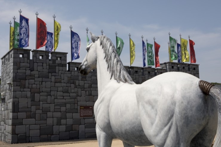 ▲ 독산성을 재현해 놓은 성곽과 세마의식에 사용된 흰 말의 형상 서랑문화마을 체험장의 홍살문을 통과하면 권율장군의 세마(洗馬) 의식을 떠올리게 하는 늠름한 흰 말과 작은 봉화대가 만들어져 있다. 화장실을 독산성의 성곽으로 꾸며놓은 아이디어가 돋보였다. 바람에 나부끼는 깃발은 왜적을 물리친 선조들의 늠름한 기상처럼 느껴졌다.