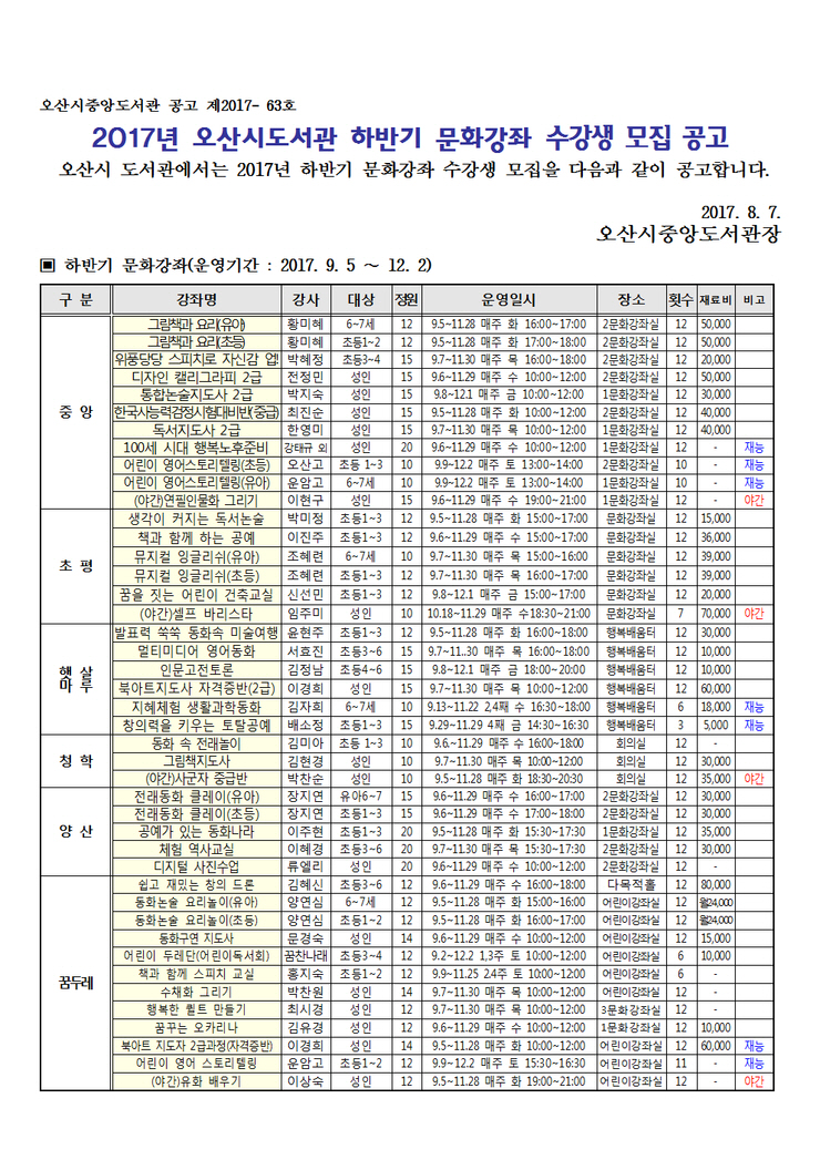 놓치기 일쑤인 2017 하반기 도서관 문화강좌 소식이에요~