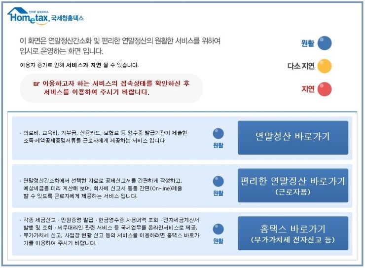 국세청 홈택스를 검색하거나 홈페이지(국세청 홈택스 www.hometax.go.kr)에 접속하면 서비스 속도를 원활, 지연 등으로 파악할 수 있도록 신호등으로 표시가 돼 있고, 로그인은 공인인증서로만 가능합니다.