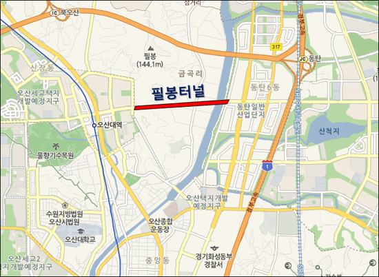 2017년도 11월. ![]() ▲ 필봉 터널의 바로 앞 오산 세교 쌍용예가 아파트 단지가 보인다.