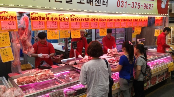 대형마트 못지 않게 정갈한 정육점에서는 마이크로 호객행위를 하는 판매원들이 분주하다.