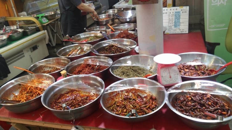짭쪼름 달콤한 밑반찬들이 스테인레스 용기에 풍성하게 담겨있어 식욕을 돋운다.
