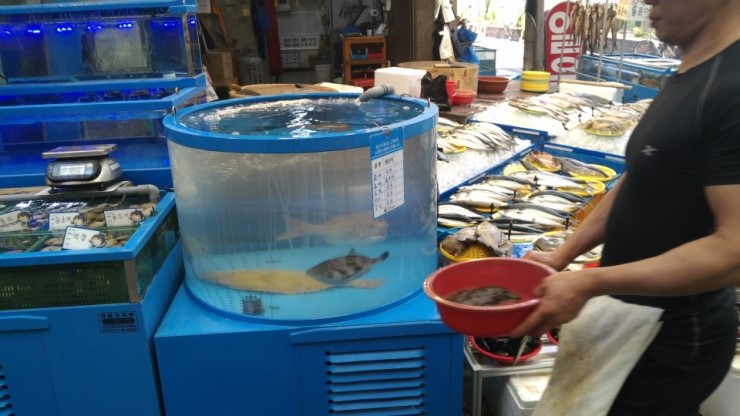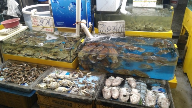 싱싱한 해산물이 수족관과 판매대에 보기 좋게 진열되어 있다.