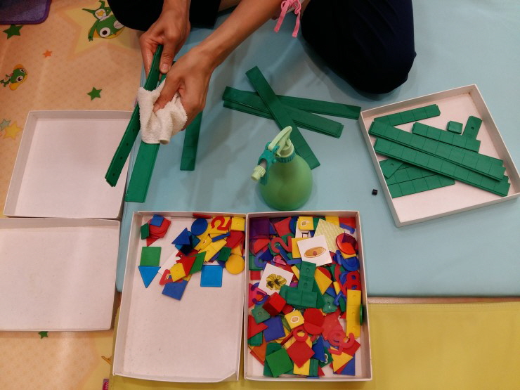 △ 선생님이 직접 식품첨가물을 혼합한 살균소독제로 장난감을 하나하나 닦아주십니다.