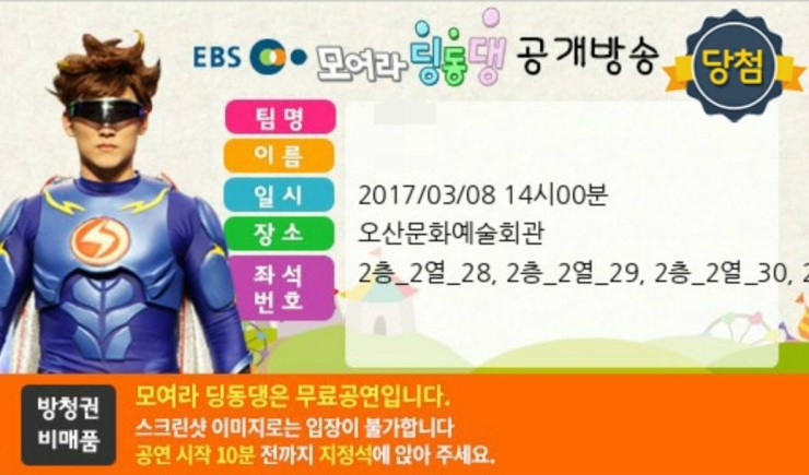 번개~ 번개~ 번개~~~~~ 충전!! 바람처럼 (다다다다다다다다다다다다) 유아부터 초등학교 저학년까지의 아이가 있는 가정에서는 엄마도 익히 알고 부를 수 있는 번개체조 가사입니다. 저희 집에선 아이가 3살 무렵부터 열심히 부르고 체조를 따라 해서 저와 남편에게도 친숙한 노래이죠. 제가 어렸을 때는 아이들이 망토를 두르고 슈퍼맨 흉내를 내곤 했었고 이후 줄줄이 배트맨, 스파이더맨, 아이언맨 등 할리우드판 히어로들이 인기를 누렸었죠. 그러다가 제가 엄마가 되어 만난 번개맨은 우리나라 토종 히어로라 참 반가웠습니다. 제 아이도 재작년 봄 오산문화예술회관에서 '모여라 딩동댕' 공개방송을 처음 보고 번개맨에 홀딱 반했었죠. 작년 오산 공개방송을 놓쳐서 너무 아쉬웠었는데 올해에는 지인이 알려줘서 제때 신청하고 다행히 당첨이 되었어요. 덕분에 새 단장한 오산문화예술회관에서 처음 공연을 보게 되었습니다.