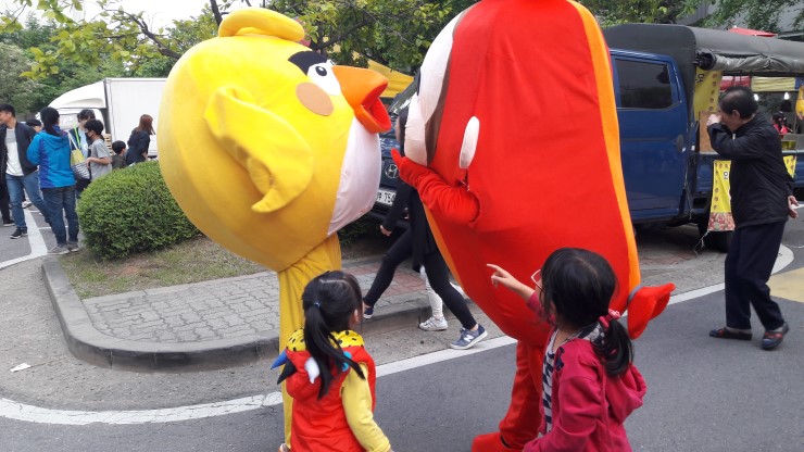 코코몽과 앵그리버드가 싸우는 퍼포먼스를 보이고 있네요.