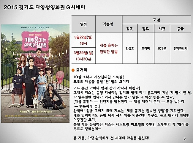 "망원동 인공위성" 영화소개는 아래를 참고하세요. http://movie.naver.com/movie/bi/mi/mediaView.nhn?code=112220&mid=26261#tab "개를 훔치는 완벽한 방법"은 두 번 상영하는데요. 이 영화는 일반 영화관에도 상영되었는데, 많은 호평을 받은 영화이지요.