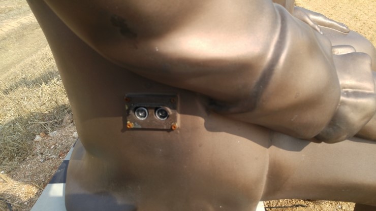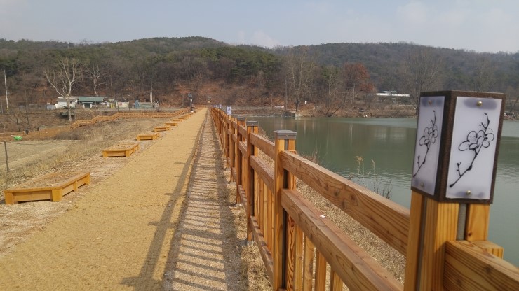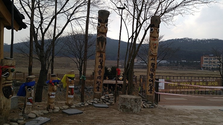 저수지 둑방 산책로 입구에 서랑마을 대장군과 여장군