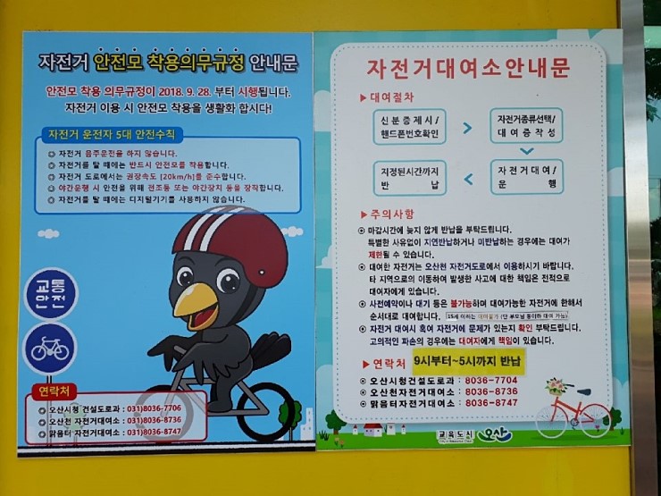 따뜻한 가을 햇살과 청정하고 시원한 공기로 자전거 타기 딱 좋은 날씨입니다. 서울에 한강공원이 있다면 오산엔 맑음터 공원이 있지요? ![]() ![]() 서울 한강공원은 여가와 레저를 할 수 있는 보트나 수상스키, 실외 수영장과 습지생태공원, 그리고 자전거가 있다면 오산 맑음터 공원엔 지난여름을 시원하게 해주었던 물놀이장과 바쁜 일상 속에 쉼과 추억을 허락하는 캠핑장, 생태학습체험관인 에코리움, 그리고 오산천을 돌며 계절의 정취를 느껴볼 수 있는 자전거가 있습니다. ![]() ![]() 자전거 타기는 남녀노소 모두가 쉽게 즐길 수 있고 자전거 여행을 하며 계절의 정취도 느껴보고 편안하고 자유롭게 할 수 있는 장점이 많은 것 같습니다. 오산천변 자전거길은 자전거전용도로와 보행자 전용도로가 나누어져 있어 안전하고 편안하게 하이킹을 즐길 수 있답니다. ![]() ![]() 오산시민이라면 자전거보험에 모두가 무료 자동 가입돼있는 거 아시죠? 혹시나 모를 사고에 대비하기 위한 오산시민을 위한 배려라고 생각하면 될 것 같습니다. ![]() 중간 코스엔 시원하게 흐르는 냇물 가운데에 예쁜 돌다리가 놓여 있습니다. 쉬어가기 하며 아이들과 돌다리를 건너봐도 재미있을 것 같습니다. ![]() 요즘 오산천변 자전거 코스 길이 공사를 하고 있는데요. 오산시민들의 더 나은 여가 환경과 안전하고 깨끗한 자전거길을 만들기 위해 공사를 하고 있습니다. 공사가 마무리되면 코스모스 흩날리는 가을바람을 맞으며 쌩~ 쌩~ 자전거 여행을 떠나도 좋을듯합니다. ![]() |