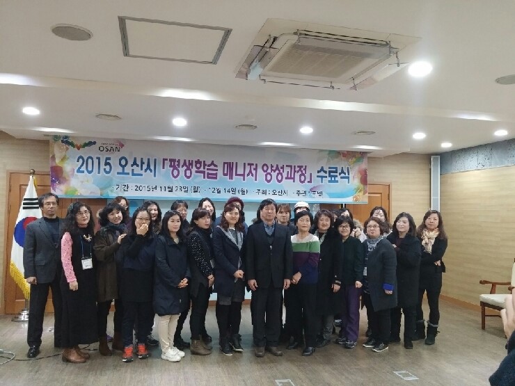 오산시에서 주최하고, 휴넷에서 주관한 평생학습 매니저 양성과정 기간은 2015년 11월 23일(월) ~ 12월 14일(월)까지 진행되었고, 온라인 32시간 오프라인 17시간으로 총 49시간을 23명이 이수하였습니다. 우리 오산시가 평생학습 도시로 선정된 것은 모두 아실 텐데요. 이번에 교육을 받으신 매니저란 평생학습 마을을 기획하고, 프로그램화 하는 역할을 할 수 있는 과정입니다.