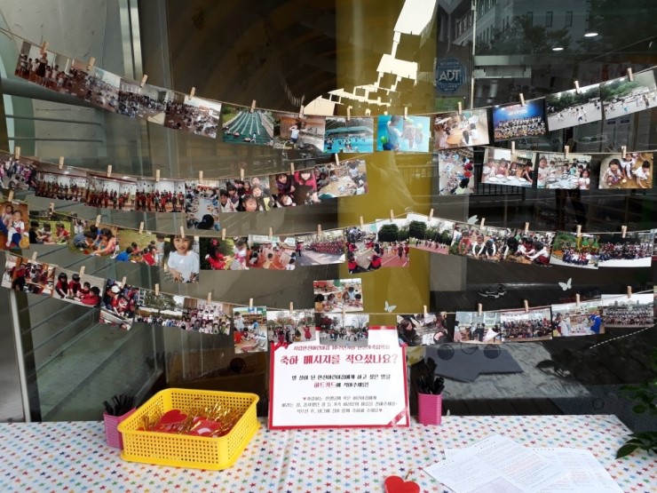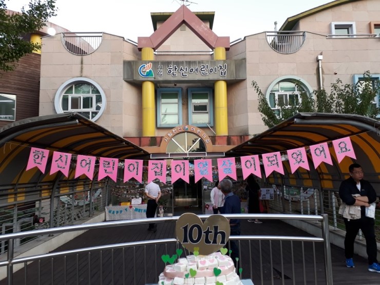 한신어린이집 열 살을 의미하는 떡케이크가 데크 앞에 놓여 있고 데크 위에는 졸업생들, 재원생들의 지난 10년 동안의 이야기가 담긴 사진들이 성장앨범처럼 전시되어 사진을 보며 추억을 되새겨보는 시간이 되었습니다.