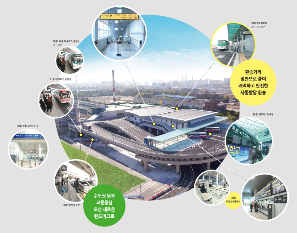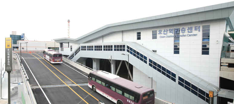 ▲ 시민 10년 숙원사업 오산역 환승센터 완공 전국 최초 철도 위에 오산역 환승센터가 11월 1일 개통됐다. 한 곳에서 모든 대중교통 수단 이용 가능한 환승센터는 일일 이용객 25,000여명 예상, 명실상부한 대중교통의 중심적인 역할을 함으로써 지역상권 활성화와 오산의 균형 발전에 기여할 것으로 예상하고 있다. 지난 2003년부터 장기간 표류한 오산터미널 재건축사업을 시가 직접 나서 터미널 기능을 포함한 환승센터 건립을 추진한 사업으로 시는 2단계 사업으로 오산역 광장에 분수와 야외무대, 조경 등 휴게광장을 조성하고 3단계로 오산역 환승주차장 600면을 추가 설치할 계획이다. ▲ 보다 빠르고 편리한 교통 인프라 구축 세교지구와 동탄 산업단지를 연결하는 필봉산 터널공사 착공, 급증하고 있는 교통량 증가에 대비한 동부대로 지하화 공사, 오산∼사당간 광역버스노선 신설, 궐동주택밀집지역 공영주차장 준공, 버스공영차고지 및 택시쉼터 건립 등 어느 해보다 교통인프라 확충에 박차를 가했다.