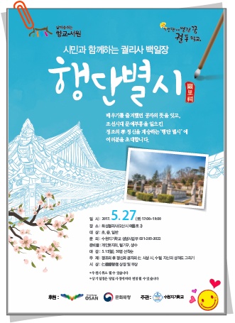오산시와 문화재청의 후원으로 수원지기학교에서는 살아 숨쉬는 향교, 서원문화재 활용사업의 일환으로 5월 27일 화성 궐리사에서 '행단별시'를 진행한다.