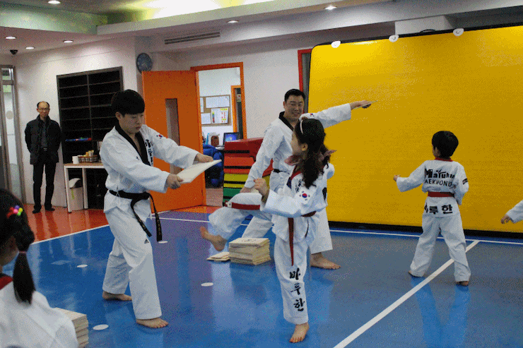 태권도 하면 역시 격파를 빼놓을 수 없지요. 좀 더 난이도 있는 3단 격파를 선보이며 부모님들의 박수갈채를 한몸에 받았습니다. 이러한 발기술이야말로 태권도가 세계 최강의 투기라 불리우며 더불어 차별성 있는 종목으로써 존재하는 이유가 될 듯 합니다.