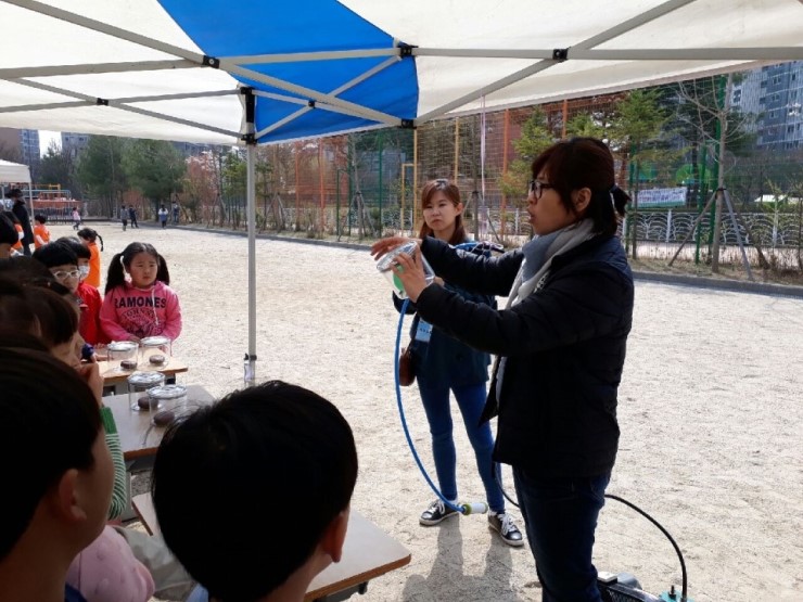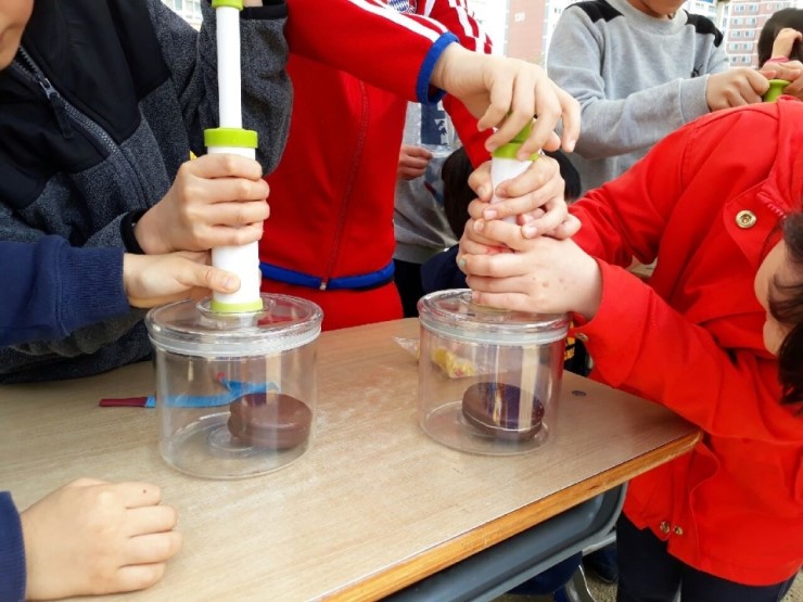 다음으로 피스톤 펌프를 이용하여 용기 내의 공기의 양을 변화시키면서 안에 있는 내용물을 관찰해보았다. 용기 안에 초코파이를 집어넣고 펌프를 움직여 공기의 힘으로 초코파이를 반으로 갈라 하얀 마시멜로를 확인하는 것이었다. 아이들은 하얀 마시멜로를 보기 위해 있는 힘을 다해 피스톤 펌프질을 했다. "팔은 아픈데 마시멜로 빨리 보고 싶어요", "초코파이 먹고 싶어요" 라며 적극적이고 재미있게 행사에 참여했다.