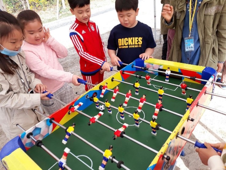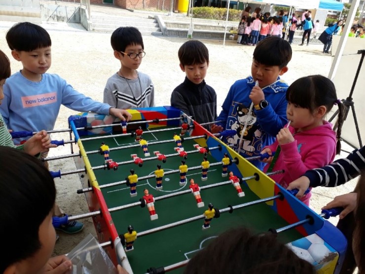 공의 탄성의 원리를 이용한 미니 축구는 두 명 혹은 네 명이 두 팀으로 나누어 공이 자기의 위치에 오면 각자의 손잡이를 돌려 인형으로 공을 쳐서 골을 얻는 체험이다. 축구를 좋아하는 남자친구들에게 흥미 있는 시간이었다.