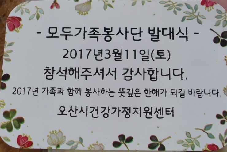 오산시 건강가정지원센터[센터장 강성옥]는 이달 11일 오전 자원봉사센터 1층 대회의실에서 ‘모두가족봉사단’ 20가정 70여 명이 참석한 가운데 2017년도 봉사단 발대식을 가졌다.