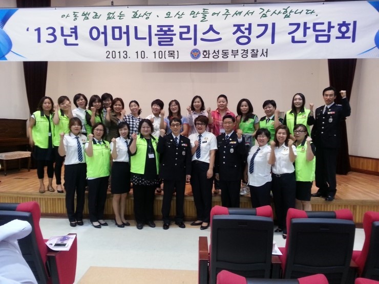 모든 폭력으로부터 아이들을 지키자!! 화성.오산 관내초등학교에서 부르면 무조건 달려가는 화성동부 어머니폴리스 대원들~ 오늘은 안전지킴이로써의 자부심을 갖고 사기진작 및 자긍심 고취를위한 교육에 참여하고자 어머니폴리스 회원들이 한자리에 모였다. 오늘 화성동부경찰서에서는 "대아동 범죄 예방"을 위한 2013년 어머니폴리스 간담회를 개최하였다. 추진배경 으로는 - 경찰 협력단체(어머니폴리스)의 4대 사회악에 대한 직무교육 및 간담회를 통한 정확한 이해로 체감만족도 향상 - 어머니폴리스 자체 간담회를 통한 사기진작 마련으로 운영 활성화 유도 및 대 아동범죄 예방 효과 극대화 를 위하여 오늘 오후 14시부터~16시까지 2시간 동안 화성동부경찰서 대강당에서 화성.오산 관내 48개교 어머니폴리스 회장님, 부회장님,총무님 이하 회원들이 약 100여명 가까이 참석한 가운데 어머니폴리스 간담회가 진행되었다