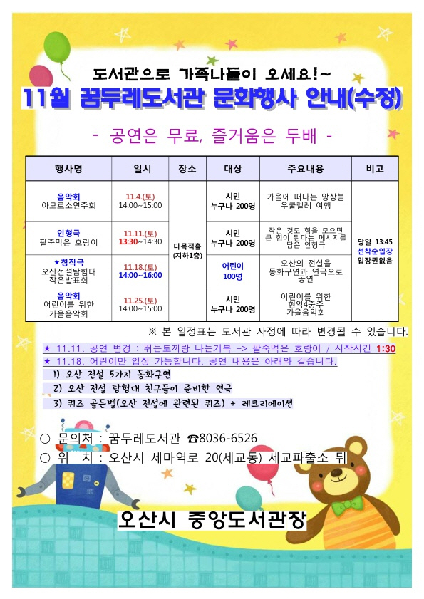 꿈두레도서관에서는 우쿨렐레 음악회를 시작으로 11월 주말 문화행사 '팥죽먹은 호랑이' 인형극과 전설탐험대의 창작극, 어린이를 위한 작은 음악회가 준비되어 있으니 가까운 꿈두레도서관에서 책도 보고 다양한 문화행사도 만나보며 유익한 주말을 보내면 좋을 것 같습니다.