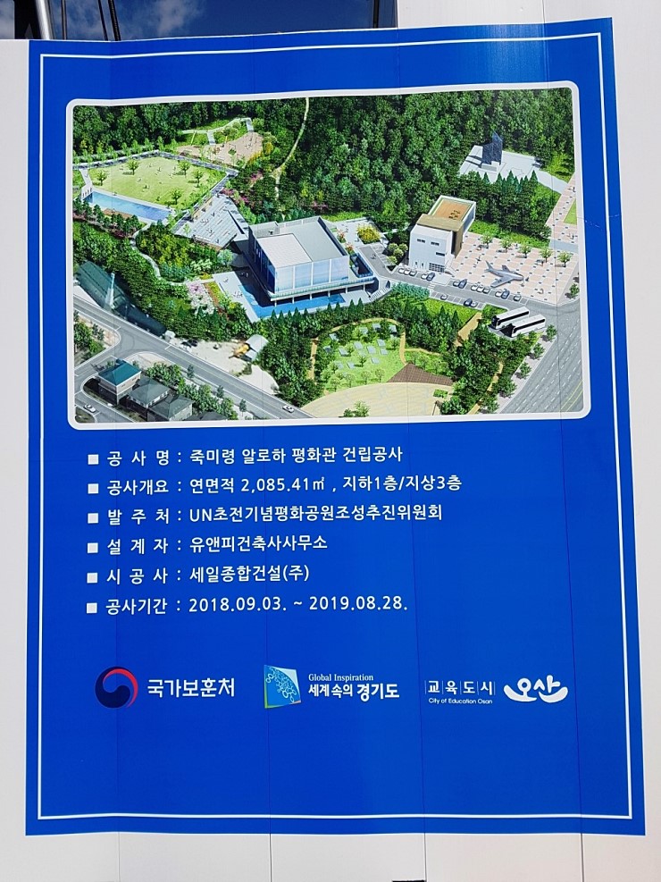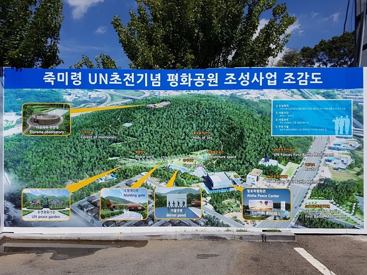 2018년 9월 2일 유엔군 초전기념관 일원에서 오산시가 2019년 8월 28일 준공을 목표로 죽미령 알로하 평화공원 건립공사를 시작하였다. 사업비는 182억 원으로 이 사업은 1번 국도변인 외삼미동 600-1번지 일원 31,261㎡ 규모의 평화공원 조성과 함께 연면적 2,120㎡, 지하 1층, 지상 3층 규모의 '알로하 평화관'을 건립하는 사업이다. 교육 체험형 추모관인 '알로하 평화관'과 '스미스부대 기억의 숲'은 엄숙 정연한 형식의 전형적인 추모관에서 벗어나, 새로운 태마 추모관의 패러다임을 제시할 것으로 보인다. 곽상욱 오산시장은 "공원 조성이 완료되면 역사체험 및 교육 관광시설로써 시민의 여가 증진, 문화 관광 인프라 확충, 새로운 일자리 창출 등 지역 경제 활성화에 기여할 것"이라며 "이를 통해 더 큰 오산으로 도약할 수 있을 것으로 확신한다"라고 강조하였다. 오산 죽미령 일대는 한국전쟁이 발발한 해인 1950년 7월 5일, 유엔군 주력부대 참전한 스미스 특수임무부대와 북한군 4사단 4천여 명이 최초로 전투가 벌어진 역사적인 장소이다. 당시 6시간 15분 동안 벌어진 전투에서는 540명의 스미스 특수임무부대원 중 181명의 사상자가 발생하였고 고도로 훈련된 북한군을 만만하게 보았던 스미스부대는 퇴각하고 말았다. 하지만 이 죽미령 전투는 유엔군의 개입으로 북한의 남침을 일시적으로나마 저지하였고, 맥아더가 북한군의 전력을 가름한 후 낙동강 전선을 구축하고 이어 인천상륙작전을 성공적으로 치르는데 중요한 역할을 하였다는데 의의를 가진다. ![]() 죽미령 알로하 평화공원 건립공사 내용을 알리는 공사안내판 ![]() ![]() ![]() 죽미령 유엔초전기념 평화공원 조성 사업 조감도 ![]() 기초공사가 한창 진행 중인 죽미령 유엔초전기념 평화공원 ![]() 죽미령 알로하 평화공원 건립과 함께 유엔군 초전기념관은 대한민국의 자유와 평화를 위해 북한군과 싸운 유엔 참전용사들의 숭고한 희생정신의 넋을 기리는 한편, 남북 화해와 평화의 전당으로 뜻을 길이 이어 갈 수 있는 역사와 문화가 숨 쉬는 오산의 역사 문화 관광 명소가 될 것이다. ![]() |